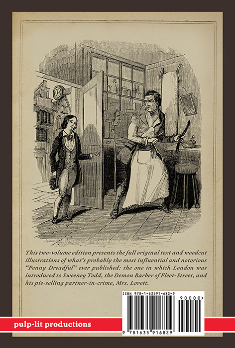 Now freshly typeset in easy-to-read modern type, this two-volume edition presents the full original text and woodcut illustrations of what’s probably the most influential and notorious “Penny Dreadful” ever published: the one in which London was introduced to Sweeney Todd, the Demon Barber of Fleet-Street, and his pie-selling partner-in-crime, Mrs. Lovett.